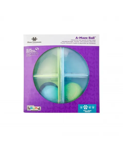 A-Maze Ball é um jogo de nível 2 (intermediário) e visa exercitar a mente do seu cão para que ele encontre a melhor maneira de obter alimento. É um brinquedo de rolar, feito para ser recheado com petiscos ou alimento que seu cão irá amar. 15 minutos de brincadeiras com estímulos mentais, equivalem a 30 minutos de brincadeiras físicas. Todo cão é um vencedor com os brinquedos da Nina Ottosson da Outward Hound. . Torna a hora da refeição em um jogo interativo! Substitui o comedouro tradicional ajudando o cão a comer em um ritmo mais lento. Ajuda a reduzir comportamentos destrutivos exercitando a mente de seu cão.
