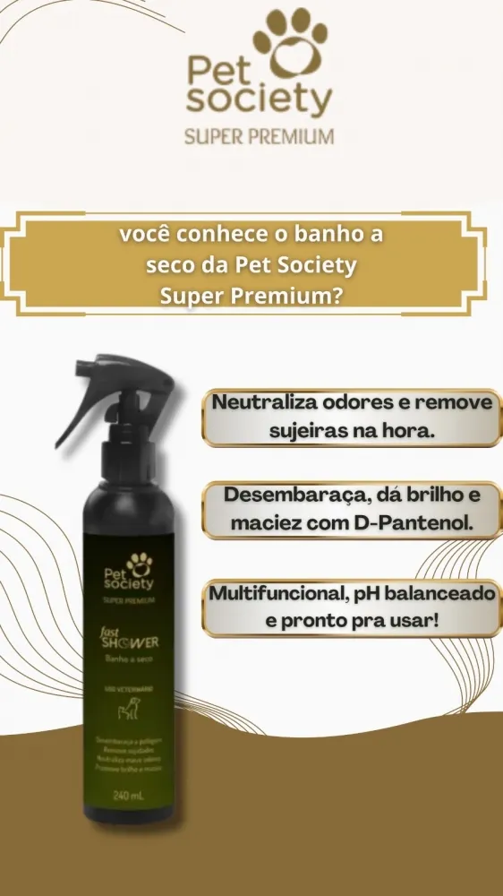 Fast Shower Super Premium da Pet Society é um produto de banho a seco para facilitar a escovação.