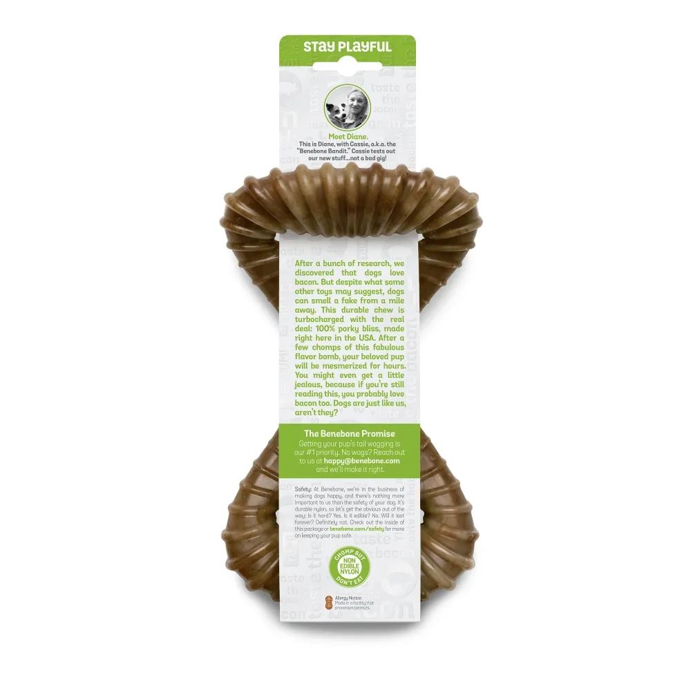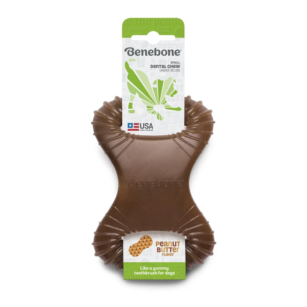 Benebone Dental Chew está disponível em 3 tamanhos e 3 sabores. Bacon, Amendoim ou Frango. Todos com apenas dois ingredientes.