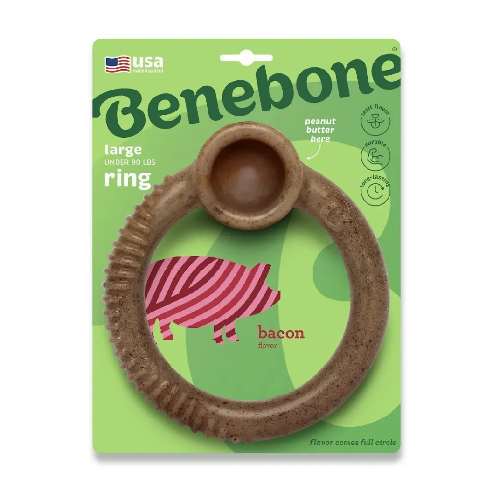 Benebone Ring é um brinquedo de roer feito de Nylon e algum ingrediente natural. Nesse caso, bacon. Não é comestível, não solta pedaços. O cão irá roer, o brinquedo desprenderá pequenos grânulos que, se engolidos, passarão inertes pelo sistema digestório do cão sem ser digerido ou causar qualquer problemas. Seu cão irá curtir demais sabor e cheiro desse brinquedo mastigável incrível. E a melhor parte, você não sentirá cheiro de nada. Você pode colocar algum alimento pastoso no recipiente no topo da argola, como pasta de amendoim ou iogurte natural ou mesmo alimento natural, para torná-lo ainda mais atrativo.