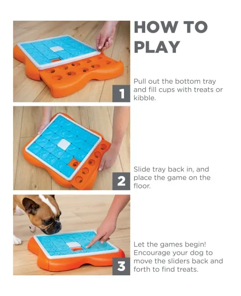 Modo de usar: 1 – Puxe a bandeja do fundo para preencher os orifícios com petiscos. 2 – Coloque a bandeja novamente no lugar. 3 - Que comecem os jogos! Coloque o jogo no chão e estimule seu cão a procurar pelos petiscos.