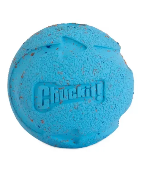 Chuckit! Ecofriendly Rebounce Ball são feitas com um mínimo de 40% de material reciclado e sua embalagem não possui plástico. Possui um quique bem alto. Feita de borracha, é muito resistente e durável se usada da maneira adequada. É compatível com os arremessadores da Chuckit!