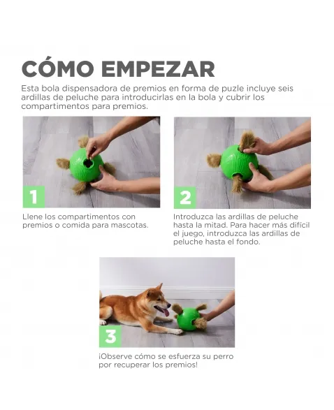 Modo de usar: 1 – Coloque petiscos ou ração nos compartimentos. 2 – Coloque o esquilo nos compartimentos, sempre pela cabeça, deixando a cauda livre. Para um desafio mais fácil, coloque menos o corpo do esquilo no compartimento de maneira que saia com mais facilidade. Para maior dificuldade, empurre o máximo que puder o esquilo no compartimento. 3 – Que comecem os jogos! Mostre ao cão como se puxaos esquilos e role a bola. Deixe-o fazer o resto.