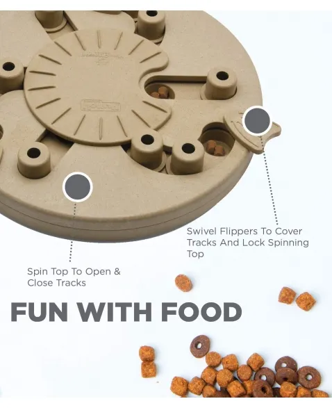 Modo de usar: 1 – Coloque petiscos nos blocos circulares e nos compartimentos da base. 2 – Vire os flippers para cobrir as trilhas e travar o disco superior.  3 – Que comecem os jogos! Coloque o jogo no chão e estimule seu cão a procurar pelos petiscos.