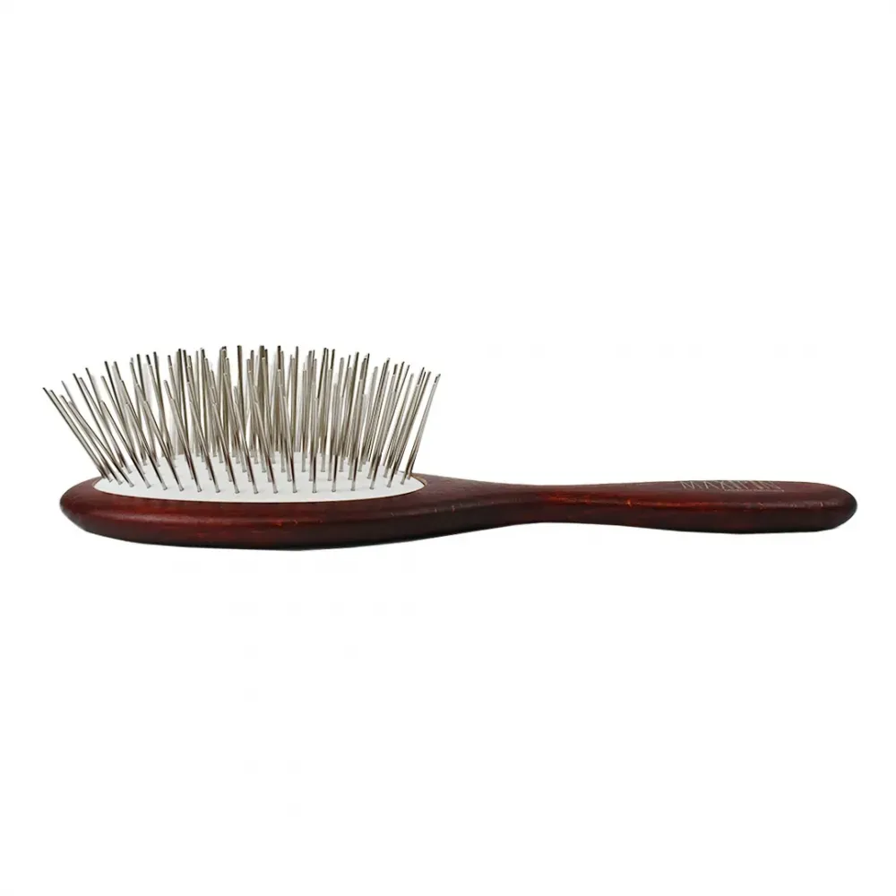 Escova ideal para pelos longos, permitindo uma escovação cuidadosa, sem danificá-los. Feita em madeira, com pinos metálicos extra longos com 3,5 cm de altura, são montados em uma almofada de borracha flexível, dando leveza no movimento e na escovação. Recomendado para pelagens volumosas e densas.