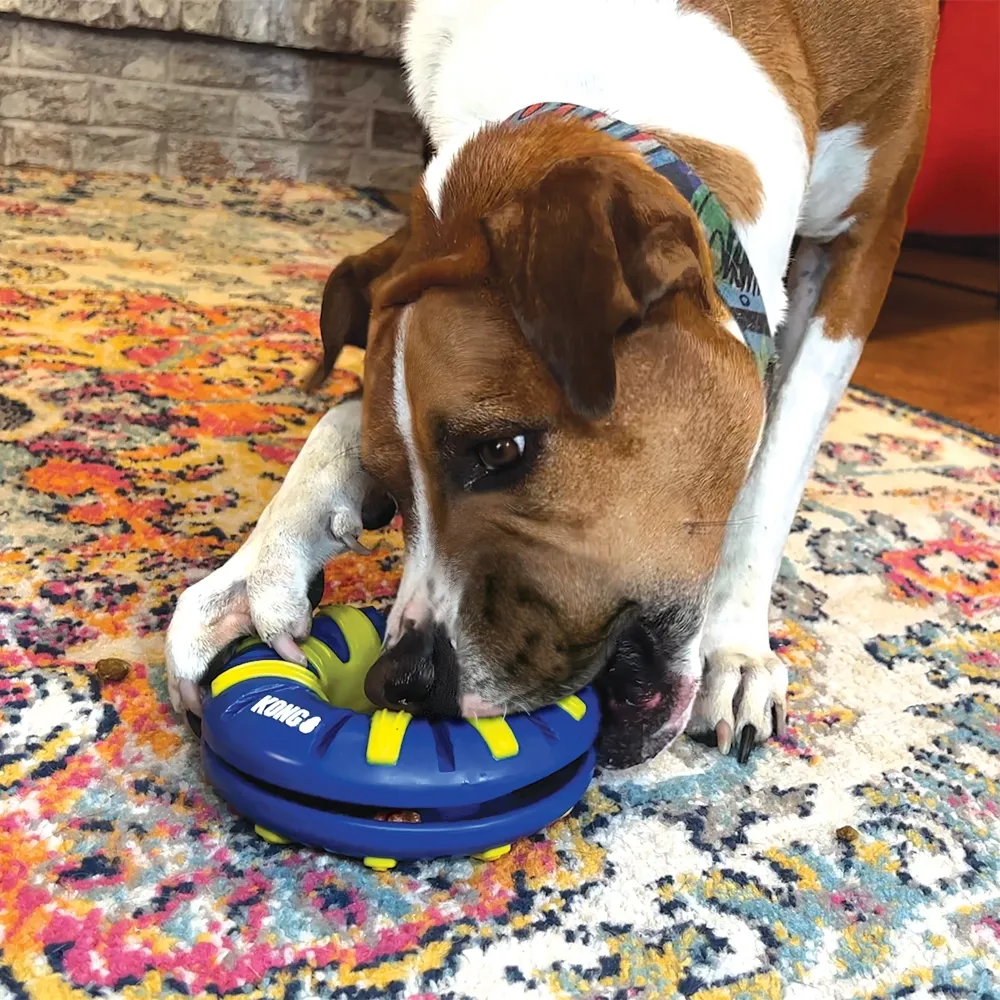 KONG Goodiez é um brinquedo que dispensa alimento lentamente, com 2 níveis de dificuldade. Rola, quica e vai soltando a ração lentamente para estimular mentalmente o seu cão, fazendo com que coma muito mais devagar que se oferecido alimento em um pote. Isso melhora a digestão, gasta energia de forma positiva e estimula a mente. Modo de usar: 1 – Puxe as duas partes para separá-las para lavar e preencher com alimento seco. 2 – Preencha com alimentos ou petiscos. Para almoço/janta, cabe até uma xícara de alimento. Se necessário mais, repita a operação mais vezes, nunca mais que uma xícara de alimento por vez. Aperte e gire para fixar novamente. Para um desafio maior, aperte para ficar mais fechado e mais difícil de sair o alimento. Para um desafio menor, deixe mais aberto. Você pode colocar petiscos nas festas na parte superior do produto para aumentar o estímulo e engajamento.