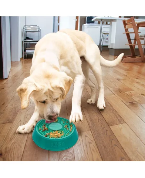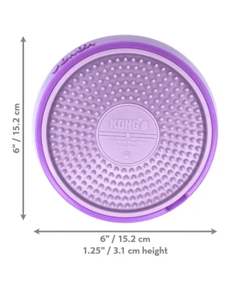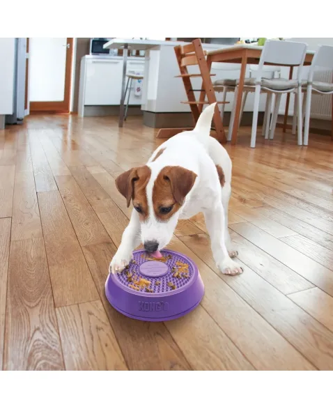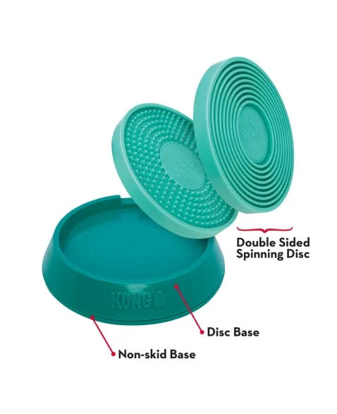 KONG Licks Spinz é um tapete de lamber muito mais divertido e desafiador que um brinquedo comum, pois o disco de lamber gira e seu “DJ Canino” vai lamber e girá-lo e essa atividade vai gerar hormônios de felicidade. O disco interno possui dois lados com texturas diferentes para variar a dificuldade e é removível para uma limpeza mais fácil. O ato de lamber ajuda na saúde mental e também a manter uma saúde oral melhor, especialmente limpando a língua do cão, ajudando a amenizar o hálito.  Possui uma base anti-derrapante para manter o brinquedo no lugar.