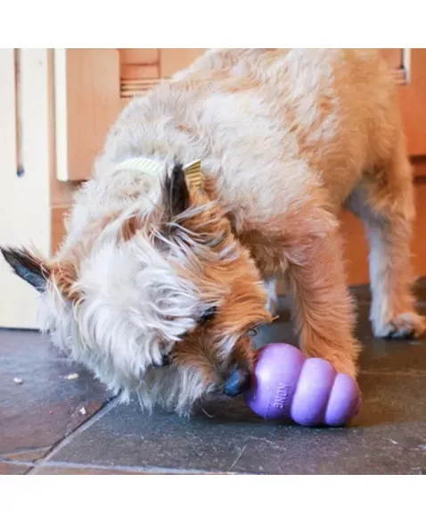 É um Brinquedo interativo que pode ser usado para brincadeiras de jogar e trazer mas principalmente para ser recheado para satisfazer necessidades primitivas dos cães que é trabalhar pelo alimento, morder e lamber. Pode ser congelado para desafios ainda mais interessantes e duradouros. Um cão que passa 30, 40 minutos para tirar um recheio congelado do KONG se cansa a ponto de não ter mais energia para roer e destruir coisas em sua casa. Além de ser exercício físico e mental, preenche o tempo de um cão entediado.