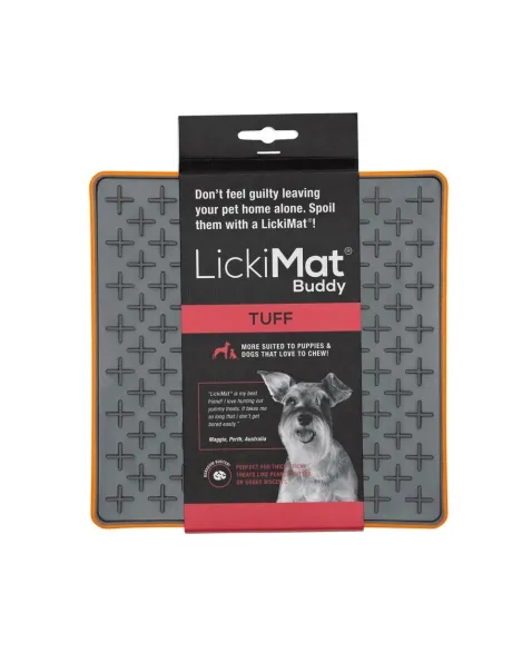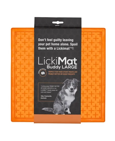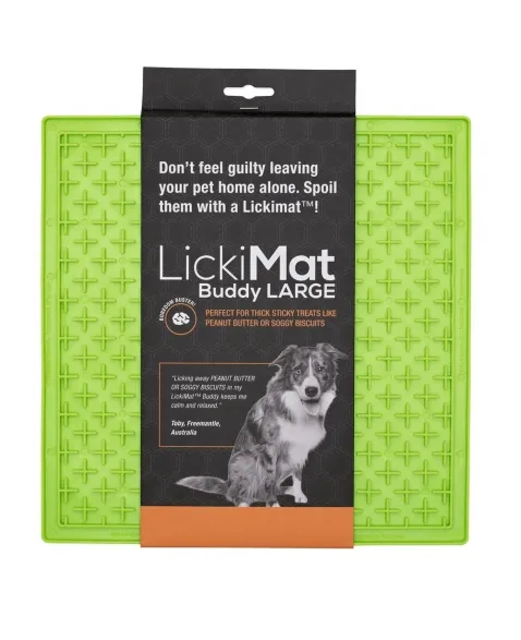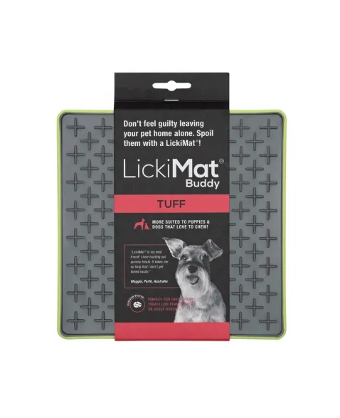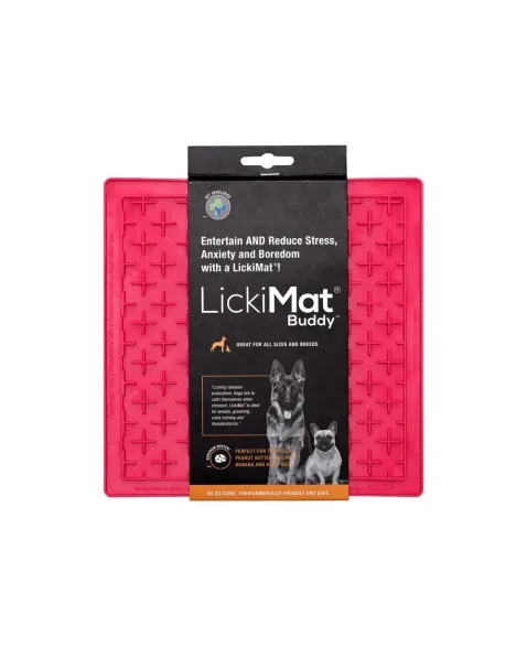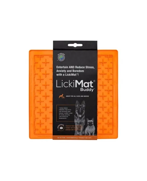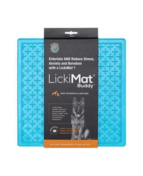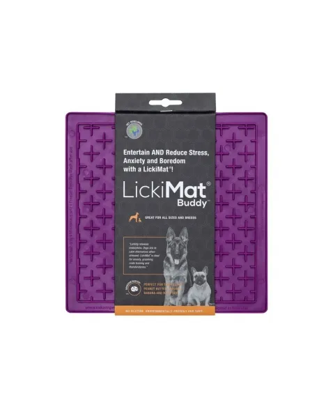 LickiMat Buddy é um alimentador desenvolvido por veterinários que tem o objetivo de divertir, reduzir o estresse, ansiedade e tédio de seu cão. Reduz a velocidade de ingestão de alguns segundos para alguns minutos. Feito 100% de borracha com grau de uso humano. Não contém silicone, BPA, PVC, ftalatos ou qualquer outro material tóxico. Indicado para filhotes, cães pequenos, médios ou grandes e até mesmo, extra grandes. E gatos também.