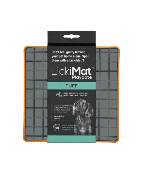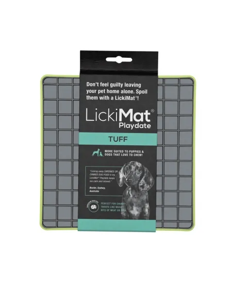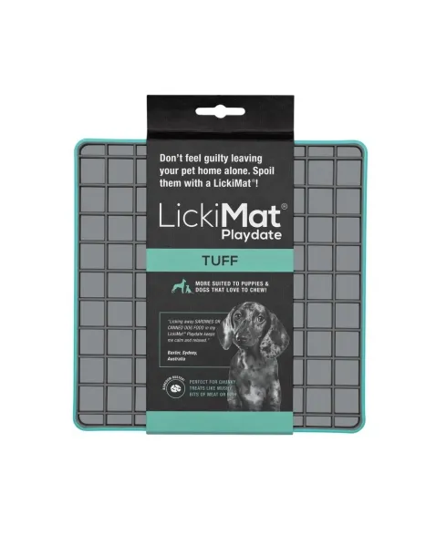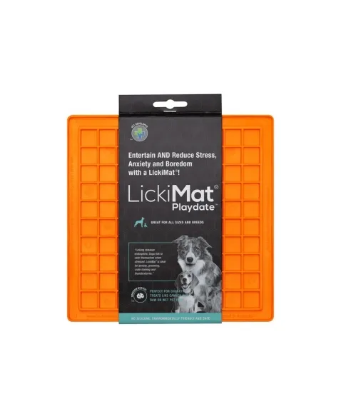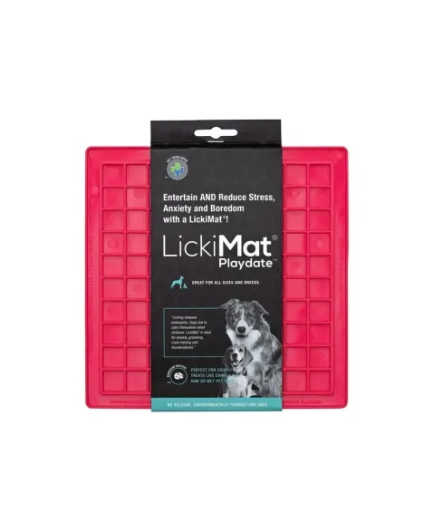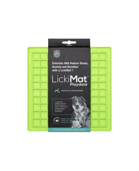 LickiMat Playdate é um alimentador desenvolvido por veterinários que tem o objetivo de divertir, reduzir o estresse, ansiedade e tédio de seu cão. Reduz a velocidade de ingestão de alguns segundos para alguns minutos. Feito 100% de borracha com grau de uso humano. Possui sulcos com desenho quadriculado. Não contém silicone, BPA, PVC, ftalatos ou qualquer outro material tóxico. Indicado para filhotes, cães pequenos, médios ou grandes e até mesmo, extra grandes. E gatos também.
