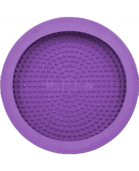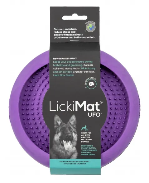 O ato de lamber libera endorfina. Os cães lambem para se acalmarem quando estressados. Por isso a Lickimat lança produtos perfeitos para ansiedade, distração, banho e tosa, treinamentos e tempestades por conta do medo de trovões. LickiMat Ufo é mais um produto da linha LickiMat que veio para inovar. É um produto que deve ser usado para colocar algum alimento pastoso para fazer que seu cão lamba, permitindo que fique distraído em situações potencialmente desconfortáveis como banhos e tosa. Evita que alimento caia no chão, por isso, excelente para passeios de carro. Ideal para alimentos crus e faz com que o cão coma lentamente. Indicado para cães de todas as idades e tamanhos.